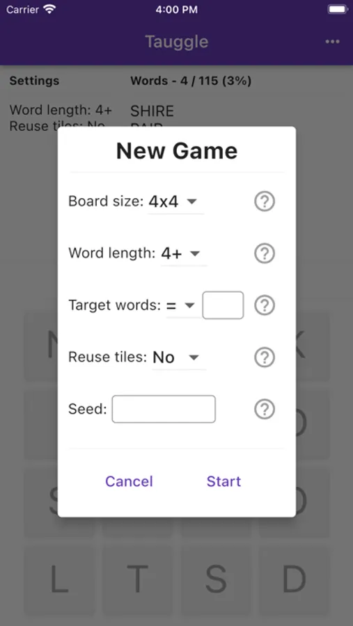 - Game settings are flexible, so it never gets stale, allowing 3x3, 4x4, 5x5, 6x6 boards, and 3, 4, or 5 minimum letters per word. Also features an optional “Reuse Tiles” game mode, which allows you to use the same tile multiple times per word, unlocking a new and challenging puzzle!