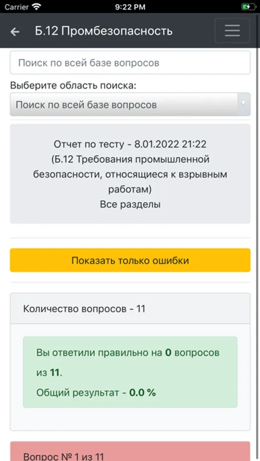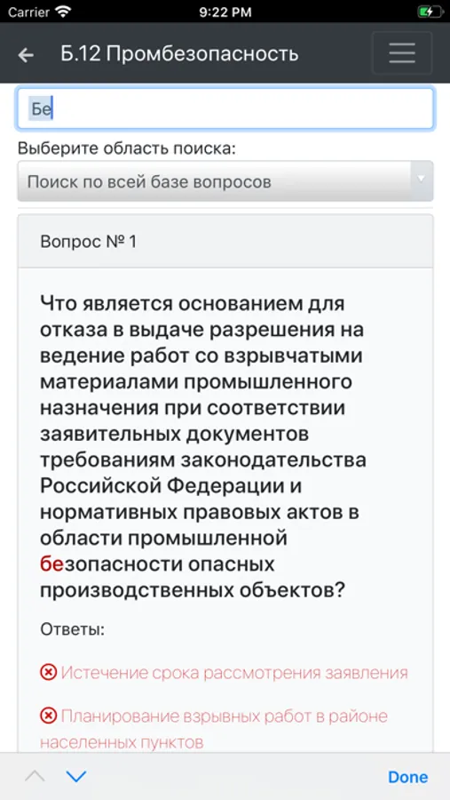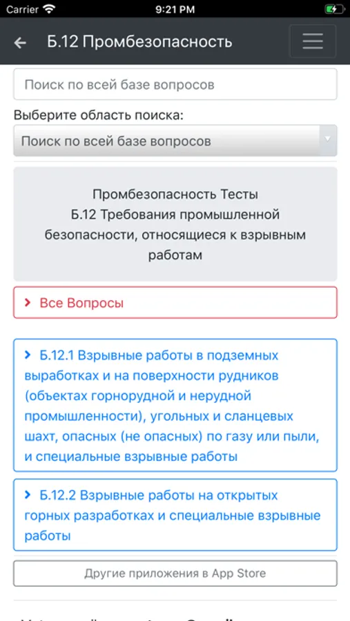 Приложение оснащено удобным поиском по всей базе вопросов или отдельной теме.