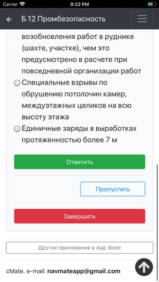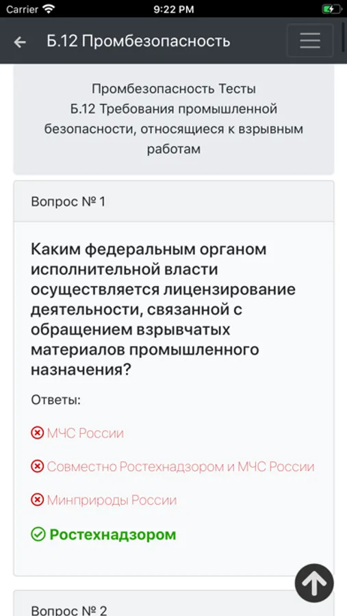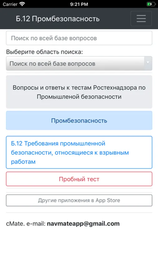 Приложение содержит полную базу вопросов и ответов с возможностью пройти пробный тест.