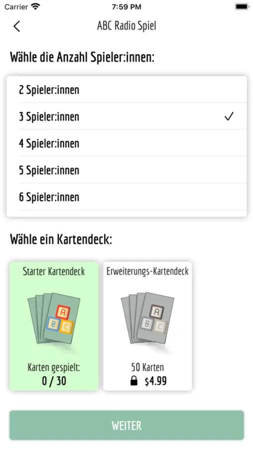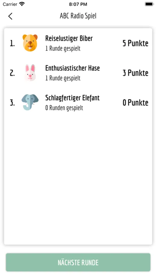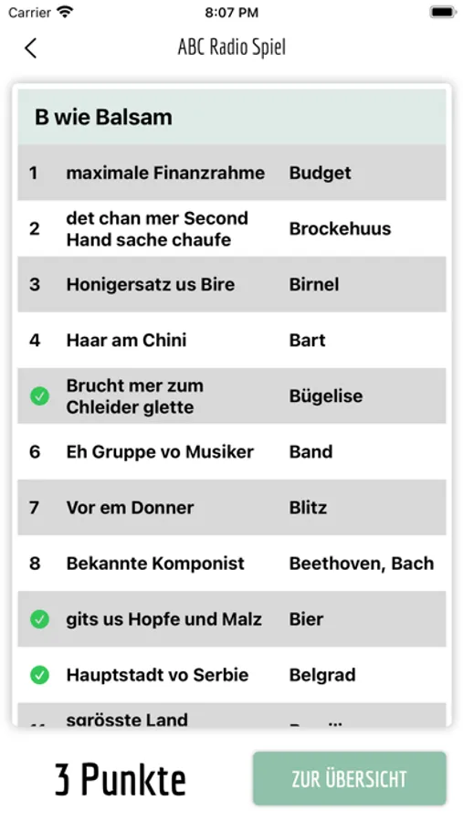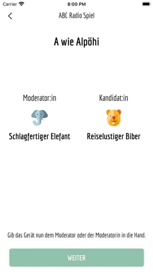 Spieler:in 1 ist Moderator:in und liest die Fragen vor. Der Kandidat oder die Kandidatin versucht innerhalb von 45 Sekunden so viele Fragen wie möglich zu beantworten. Die Antworten müssen alle mit dem gegebenen Anfangsbuchstaben beginnen.