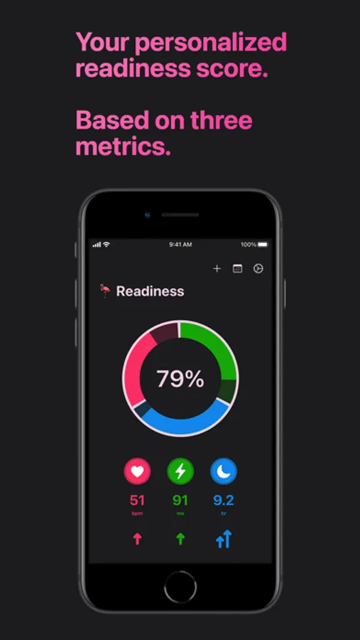 Readiness is calculated daily by measuring 3 health metrics: Heart Rate, Heart Rate Variability, and Sleep. Your data is never compared to an absolute scale - after all, everyone is different. Instead, each metric is compared against your average value to determine positive or negative trends that may indicate a need for rest and recovery. The greater these trends are, the more they impact your readiness score. Just wear your Apple Watch to sleep, then check Flamingo first thing when you wake up for best results.