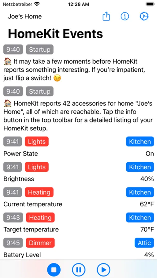 HomePeek shows you a torrent of communications, going on in your HomeKit network. You can save the log for later inspection. HomePeek will even log when it’s in the background (i. e. not the active application), although you can switch that off because it can put a strain on the battery.