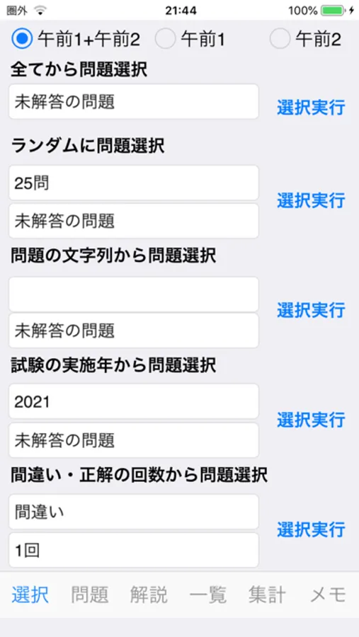 [選択]で、学習する問題を選びます。午前2問題のみの選択もできます。