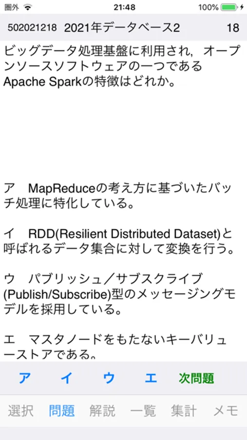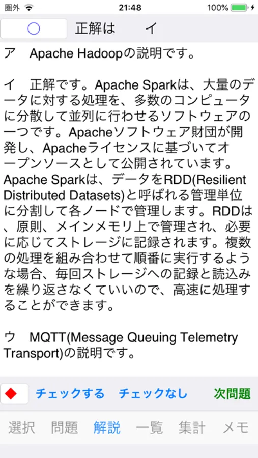 [問題]で、選択肢から、解答を選びます。解答を選ぶと[解説]画面に変わります。