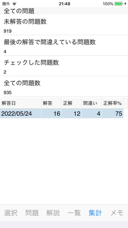 [集計]は、解答日別に、解答数、正解数、間違い数、正答率を表示します。