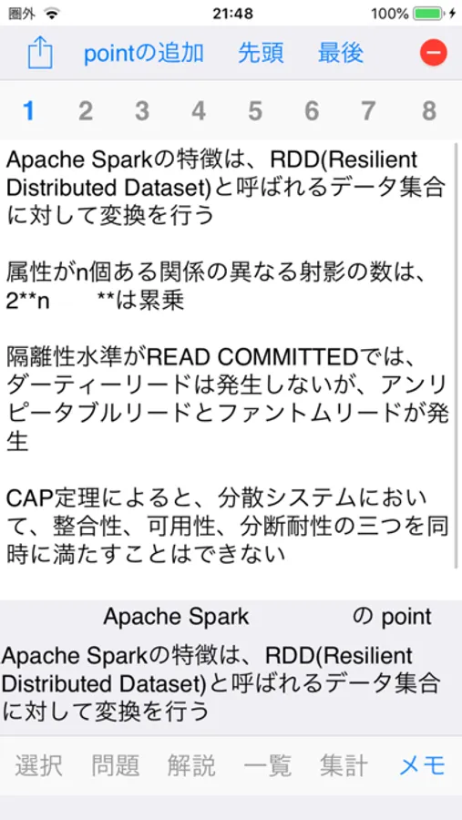 [メモ] は、メモを8つまで作成できます。問題によってはpointを登録していますので、メモに追加できます。共有ボタン(□に↑)をタッチすれば、メモをファイルに保存したり、メールで送ることができます。