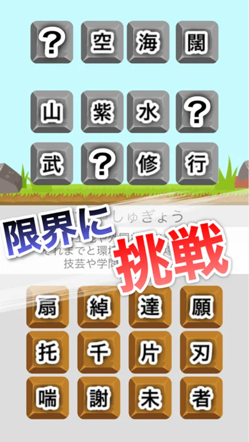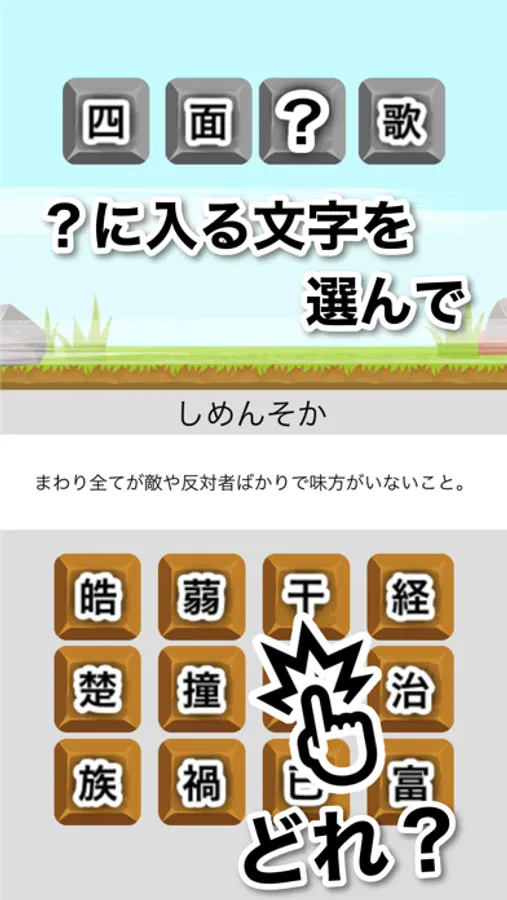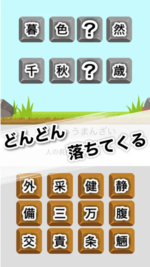 上から落下してくる四字熟語の穴埋め問題を回答する
