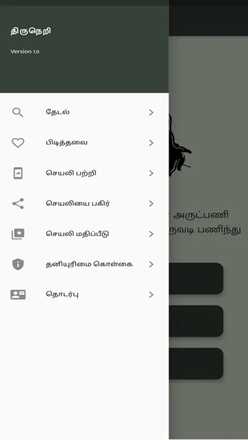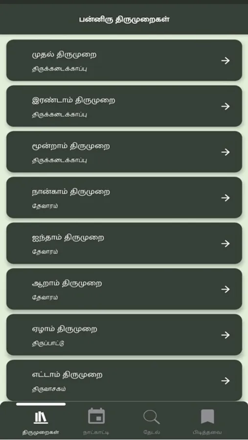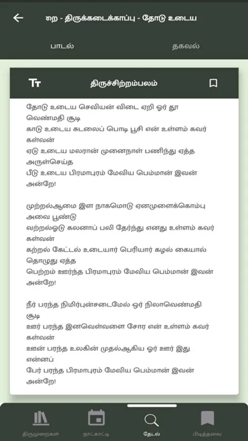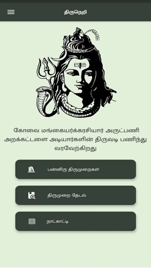 The ‘Thiruneri’ application is a humble effort of Mangayarkkarasiyar Arutpani Arakkattalai to deliver the goodness of thirumurai for the benefit of tamils living across the world and spread the Saiva Siddantha philosophy. The thirumurais are provided in simple tamil language and easy-to-navigate interface, along with specific information on the temple and place, that will greatly enhance the knowledge about the song to the reader.