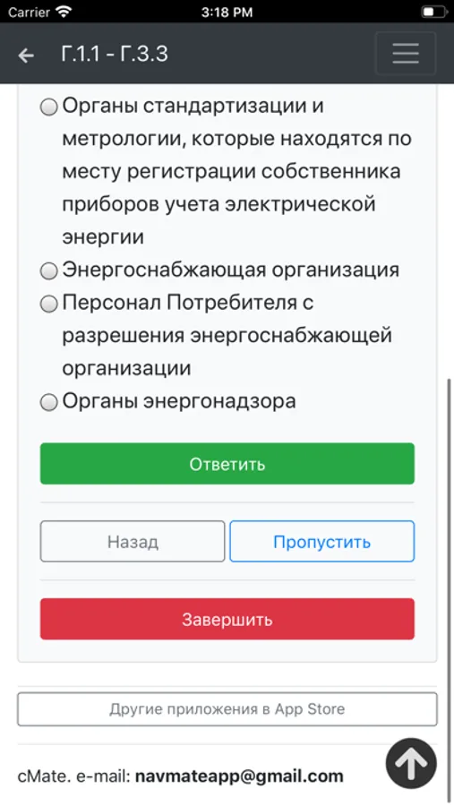 Приложение содержит полную базу вопросов и ответов с возможностью пройти пробный тест.