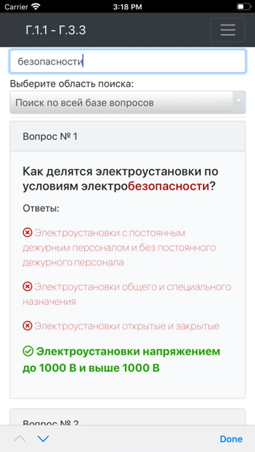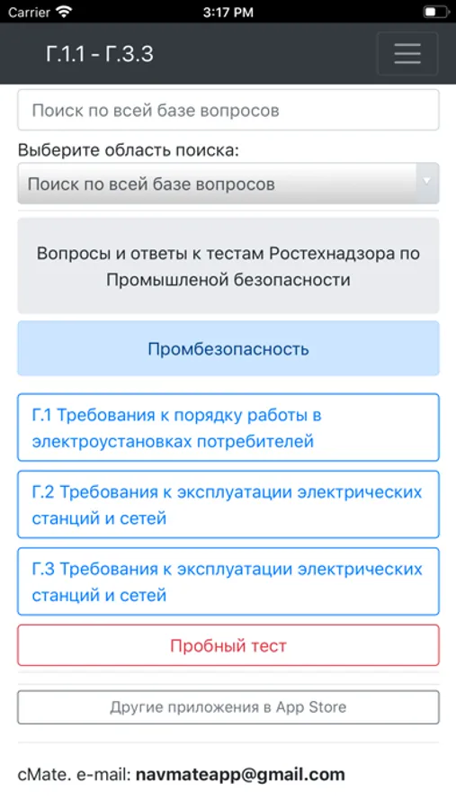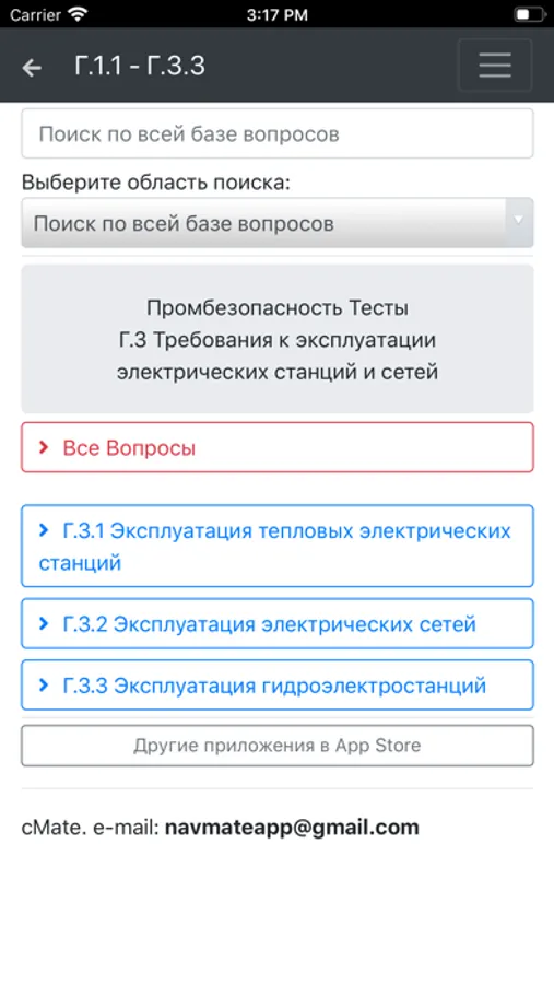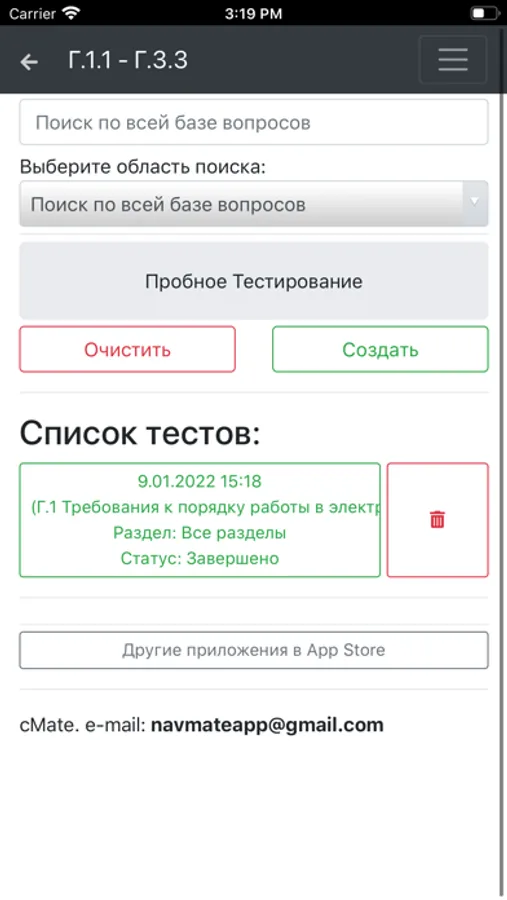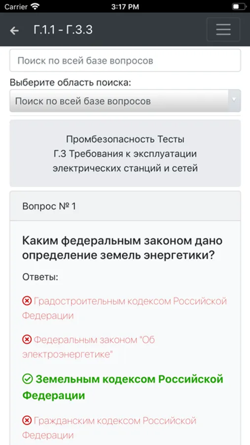 Приложение оснащено удобным поиском по всей базе вопросов или отдельной теме.
