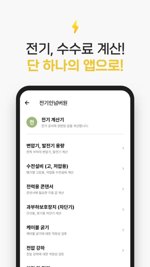 전기인 넘버원은 전기 공사, 계획, 설비 등에 필요한 모든 계산을 쉽고 간편하게 도와주는 어플리케이션입니다.
