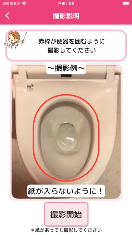 大腸内視鏡検査の前処置において、ユーザーがアプリ内で撮影した排便画像の性状を自動判定し、綺麗さを3段階で表示します。