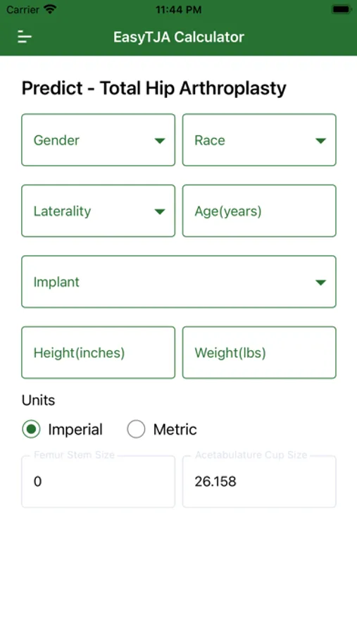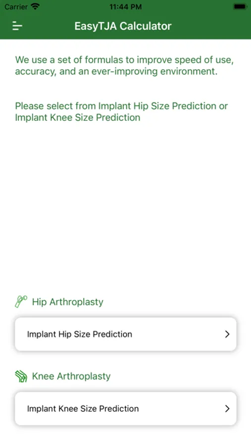 EasyTJA is a calculator application to allow Orthopedic professionals to calculate the size of a Implant needed for surgical operations on the Knee and Hip.