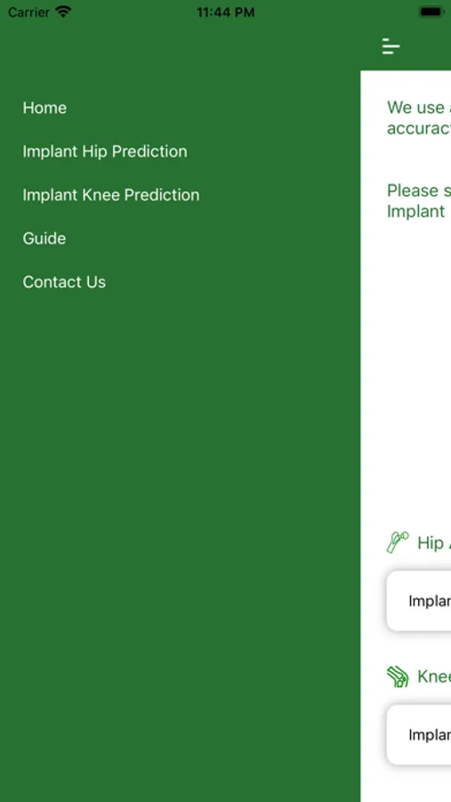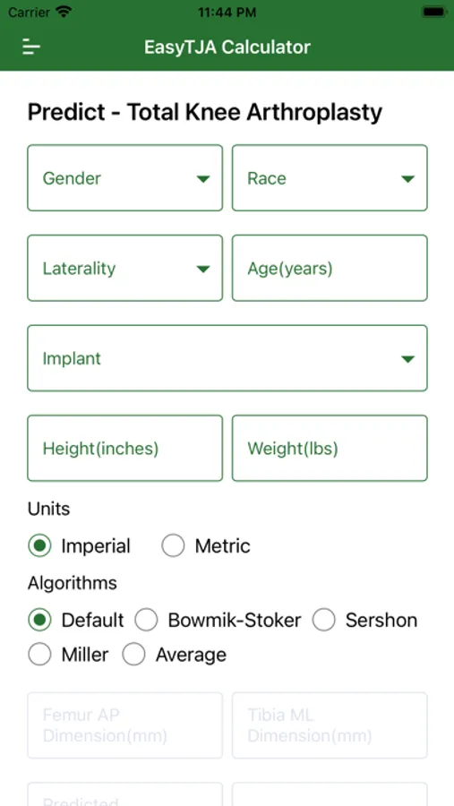 Details about the application: the Implant for the Knee has 5 options to calculate the different sizes for a given manufacturer using the Default, Bowmik-Stoker, Sershon, Miller and Average ways to compute the sizes.