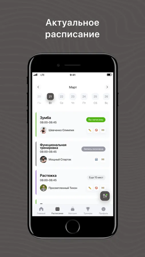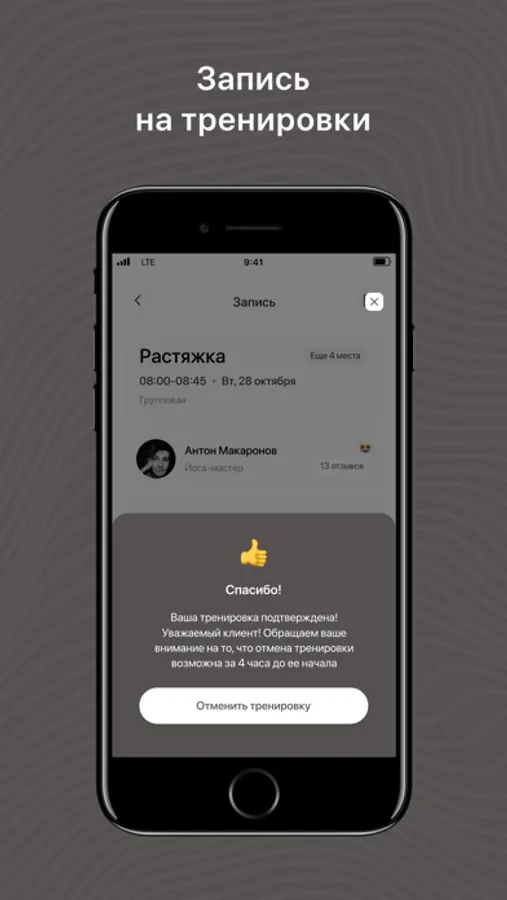 - Получать PUSH-уведомления о предстоящей тренировке;
