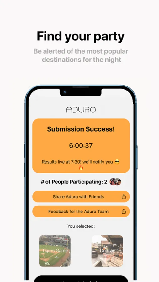 The Aduro app allows you to get the most out of your social life. We let you know who's where you are. Aduro users set up accounts and link their favorite pictures and social platforms to put their best foot forward. There is also a voting feature that allows you to let other users see where you plan on going for the evening. You can also see where others are going too!
