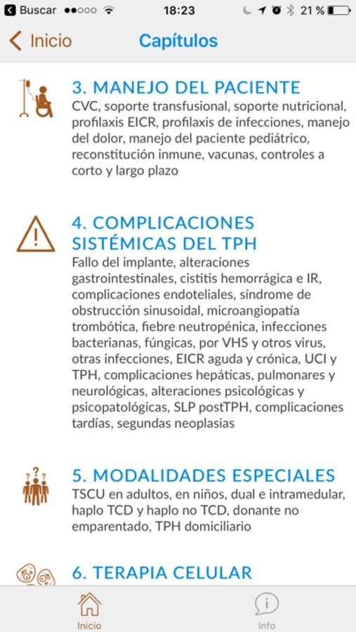 El Manual está distribuido en secciones, cada una con un listado de capítulos desde donde puede abrirse directamente el tema a consultar. La app cuenta además con: un buscador de palabras clave que enlaza con el capítulo correspondiente, la posibilidad de tomar notas, la consulta de abreviaturas, la descarga en formato PDF para su impresión, o la opción de seleccionar los capítulos favoritos para una consulta más ágil.