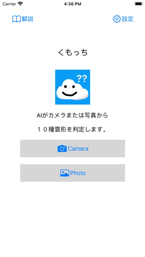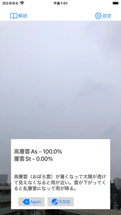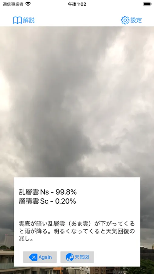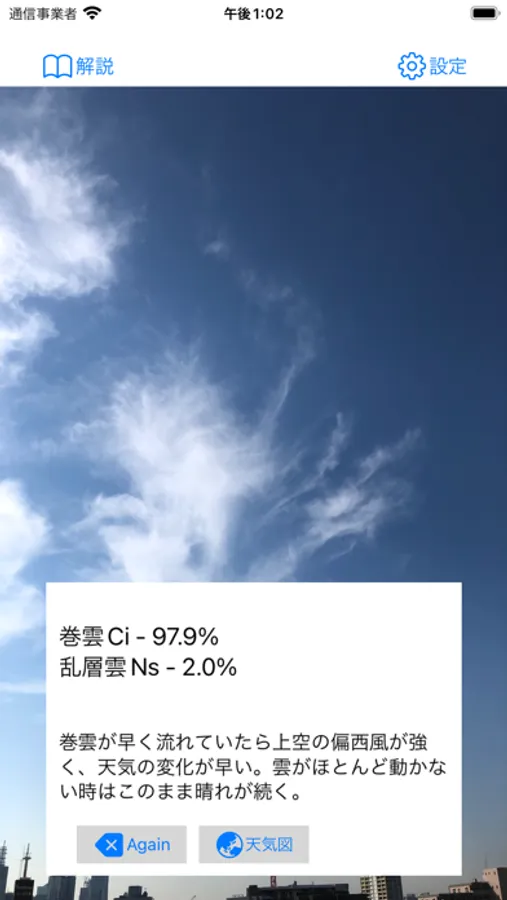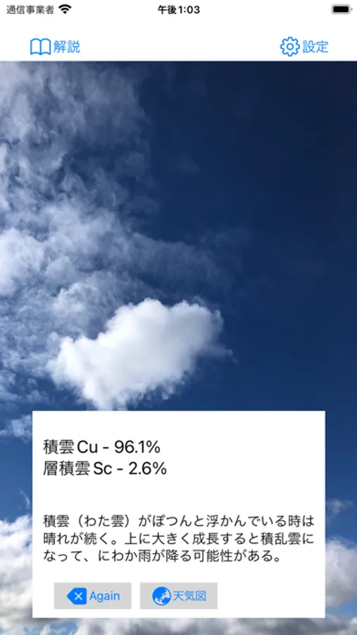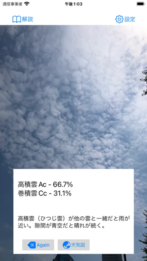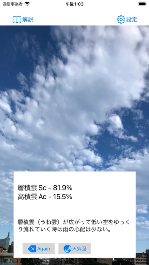 空に浮かんでいる雲を機械学習したAIが10種雲形に判別して、これからの天気の変化を予想するアプリです。