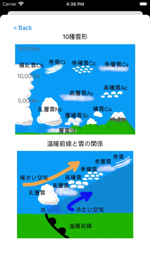 日本では前線の接近などによって空の雲が変化します。雲の種類を判別して雨が降りそうかどうか自分で判断する手助けをします。(天気予報アプリではありません。)