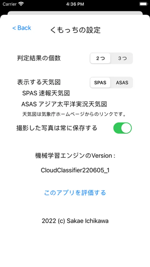 機械学習した画像認識エンジンはサーバーではなく、iPhoneやiPadのデバイス上で動作しますので、雲の判別は山奥などネットワーク環境のない所でも使用可能です。(天気図の参照にはネットワーク環境が必要です。)