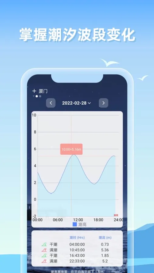 潮汐表:内置国内主要港口、岛屿及验潮站数据。查看涨潮退潮时间。