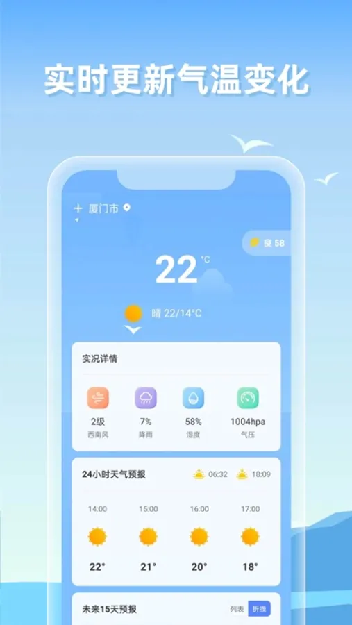 天气:当日天气和未来15天天气预报,更有空气质量和生活指数查看是否适合外出钓鱼赶海,