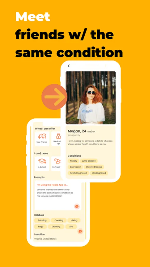 Social Network: Healp helps you find friends who have the same health conditions as you. With Healp, you can create a profile and share information about your age, location, hobbies, and medical conditions. Afterward, we will match you to friends with similarities.