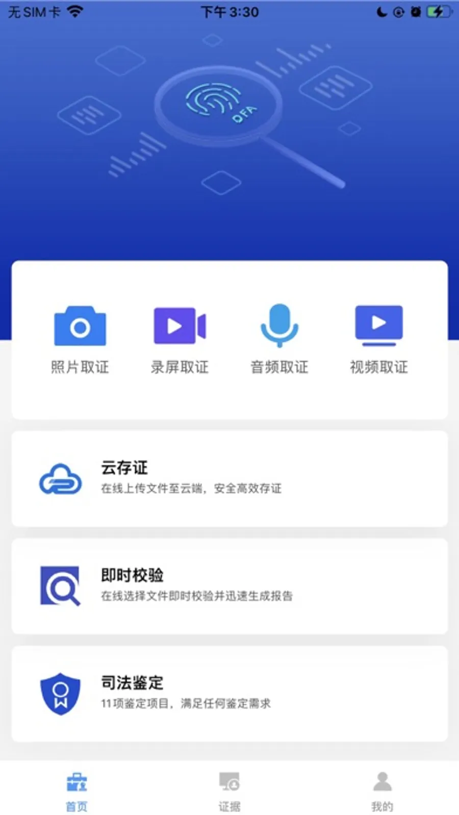 DFA是一款专注于电子数据取证的移动端应用软件,集拍照取证、音频取证、录屏取证、视频取证、网页取证、文件取证、即时校验等功能于一体。软件从技术上确保了电子证据的的可采用性,结合中科院授时中心的可信时间,利用“五要素”固定电子证据,最终生成的固定报告和校验报告均具有法律效力,有效地避免了电子证据被某些软件恶意篡改。