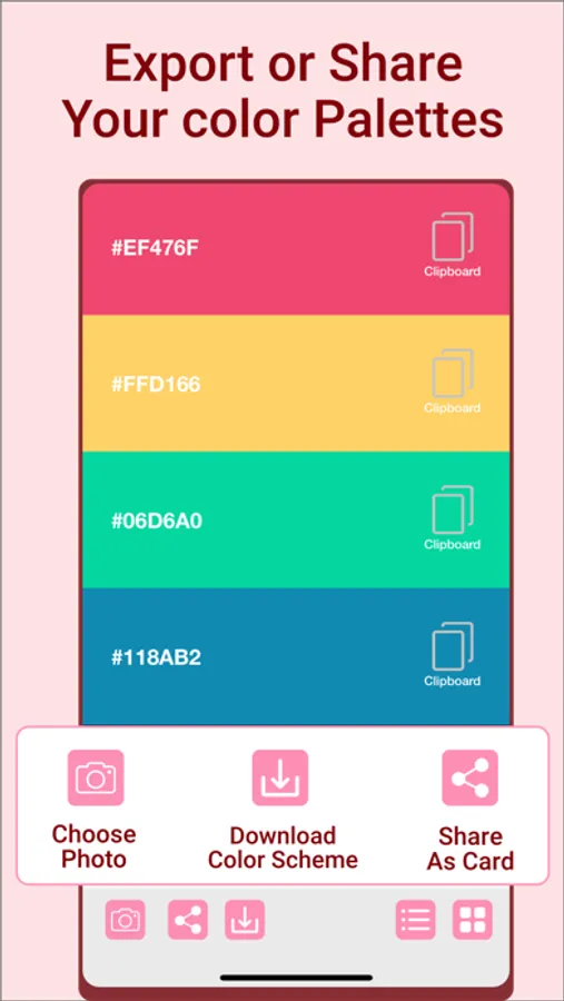 You can Export the color to your photo gallery as a reference card or in image format to simply use it as wallpaper or for designing purposes. Add a color palette to favourites to view later.