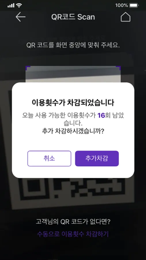 고객이 보여주시는 QR코드를 사장님 앱으로 간편하게 스캔하시면 서비스 횟수 차감 완료!