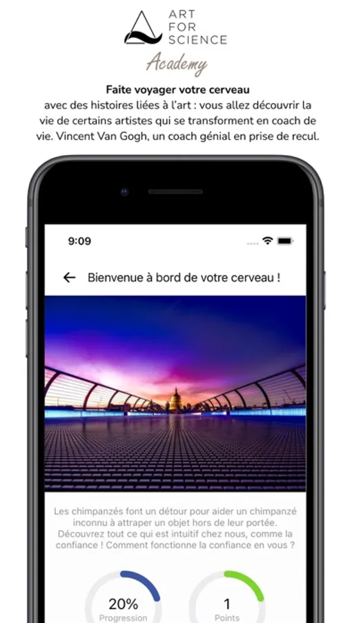 Art For Science raconte le cerveau et les bienfaits de l'art sur le cerveau : pour développer votre intelligence, votre bien-être, ou pour guérir cette appli est pour tous. Bienvenue sur cette plateforme de partage de savoirs !