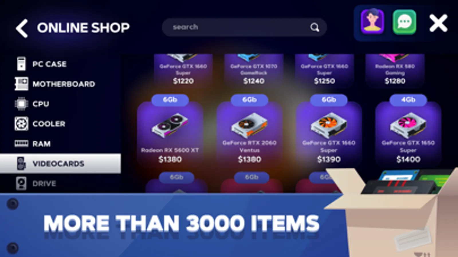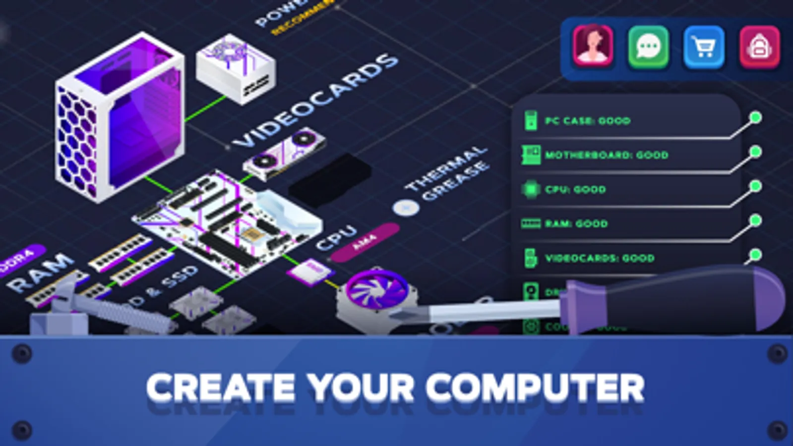 PC Creator Pro gives you the unique opportunity to build a computer, starting from choosing computer's parts and finishing with installing the operating system, testing various software and games. So, PC built-in 3D mode, installing of operating system, drivers, games and software is in your hands. In addition to this, you will be able to trade as a bitcoin miner or dogecoin miner.