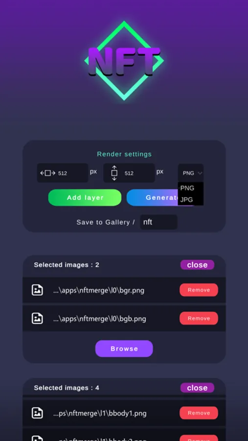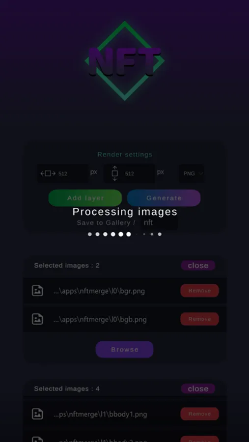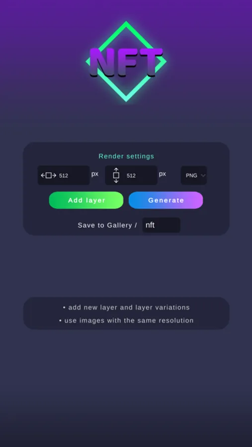 This app helps you to generate different combinations of NFTs by merging each variation of all layers.