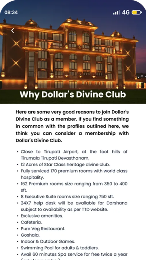 Your annual stay with us has to be booked 15 days in advance along with a visit to Tirumala and can also be utilized to plan and offer any Homam, Gau Pooja, and your prayers to other equally illustrious and important temples near and around Dollar’s Grand Club. Become a member of our Club, so that you can create your own power at Tirupati for 20 years. Do please call us or write to us for more details on how to obtain a Dollar’s Grand Club membership.