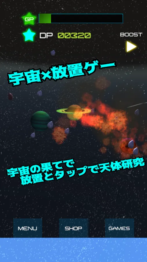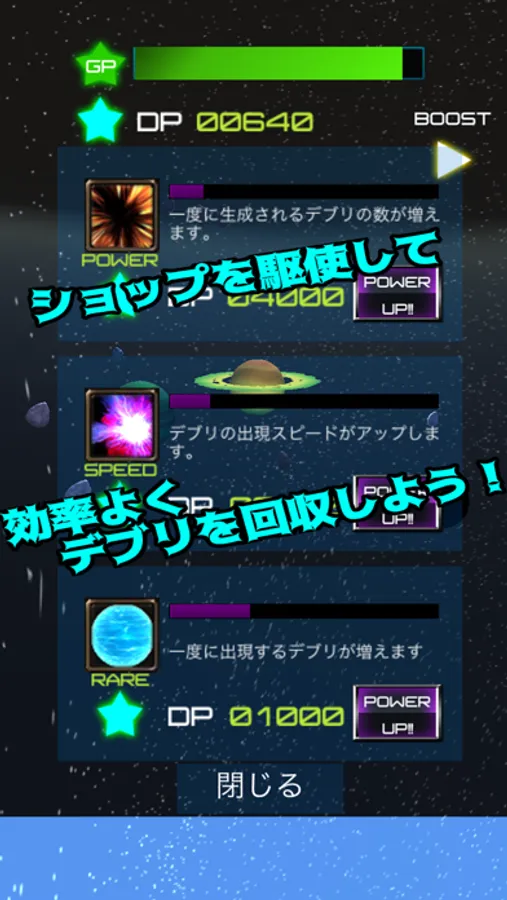 ・デブリを回収するとGPが上昇し、MAXまで溜まると天体がランダムに生成!