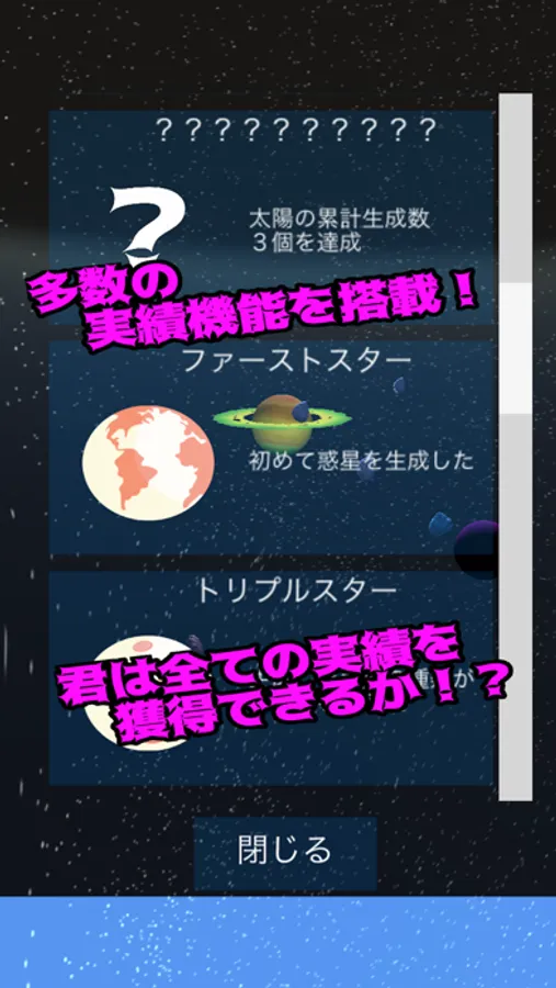 ・天体を集めたり、実績を集めたりとやり込み要素あり!