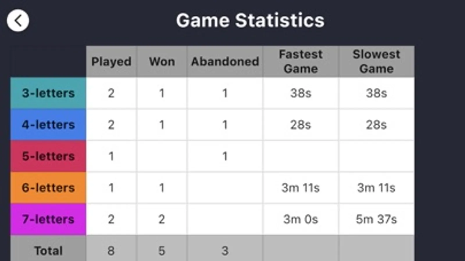 * Detailed statistics showing how many times you've played, how many times you've won, the fastest time you've won etc.