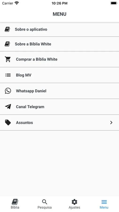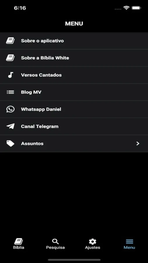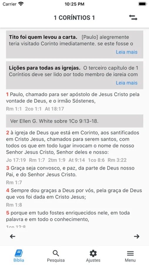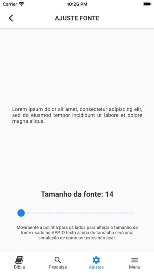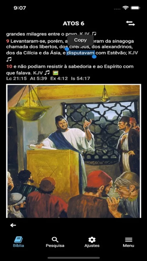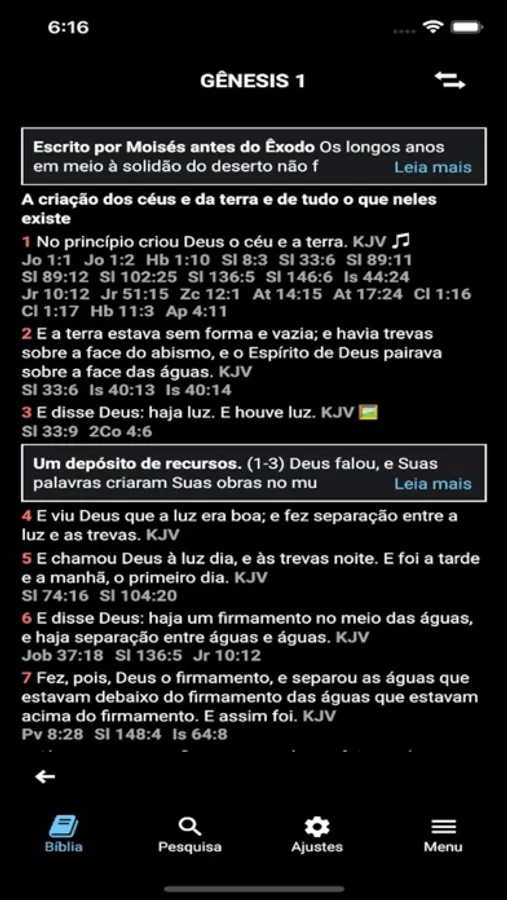 Tamanho de letra regulável, modo escuro, inglês opcional para cada verso (KJV), imagens bíblicas no texto, opcional.