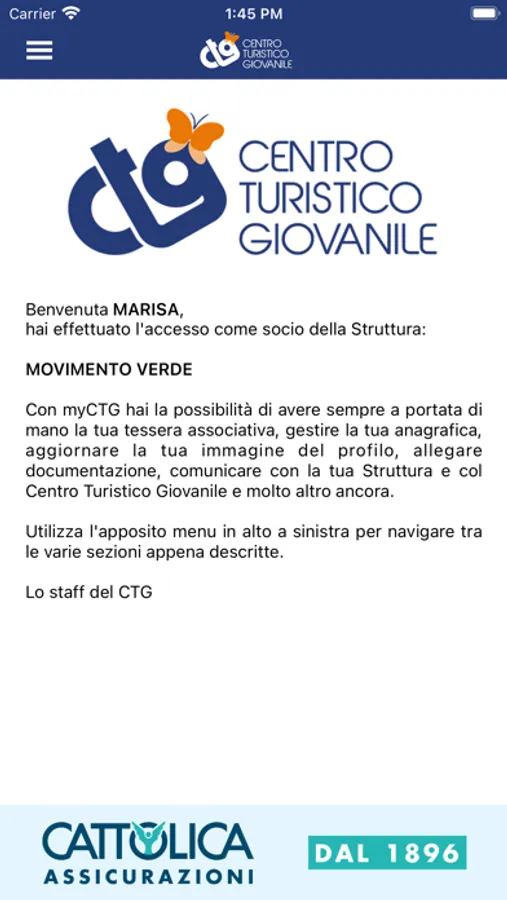 L'applicazione ufficiale del Centro Turistico Giovanile è stata creata per i suoi soci ed è ad essi riservata. Consentirà loro di avere sempre a portata di mano la propria tessera associativa, di aggiornare la propria anagrafica e la foto profilo, di inviare alla propria struttura tutta la documentazione necessaria, di comunicare direttamente con la propria struttura o col CTG e di monitorare lo stato di avanzamento delle proprie richieste.