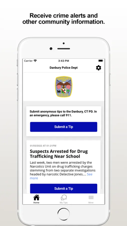 The Danbury PD Tip app provides citizens the ability to submit anonymous tips to the Danbury, CT Police Department. The app also displays agency crime alerts and other organization web and social media content.