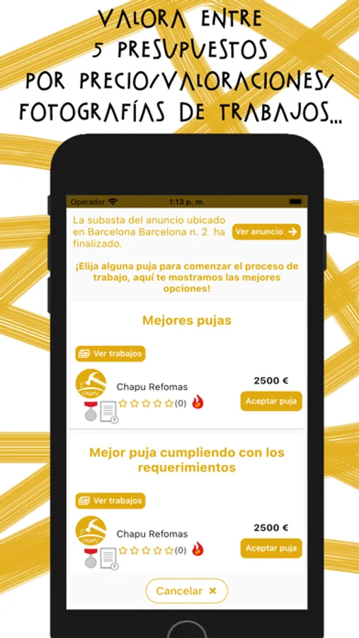 Chapú, más que una plataforma de reformas, mudanzas, mecánica y chapa y pintura, es una comunidad de confianza, construidas con valoraciones reales entre profesionales/clientes y certificaciones que se irán obteniendo, donde podrás ofrecer o recibir presupuestos de una manera totalmente diferente y dinámica, gracias a nuestro sistema innovador de subastas, donde el profesional podrá dar un presupuesto acertado sin tener que ir a casa del cliente y a su vez el cliente podrá ver los mejores precios del mercado con la confianza de contratar a un excelente profesional.