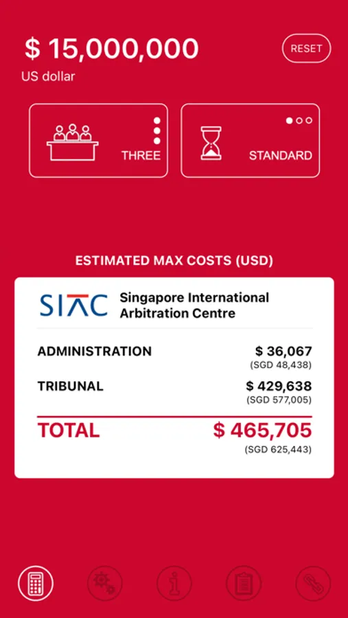 The Reed Smith Arbitration Pricing Calculator app enables you to calculate the expected maximum administrative and tribunal costs of arbitration in more than 20 currencies based on several inputs, such as: