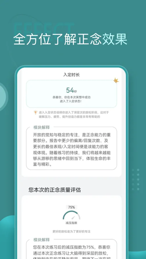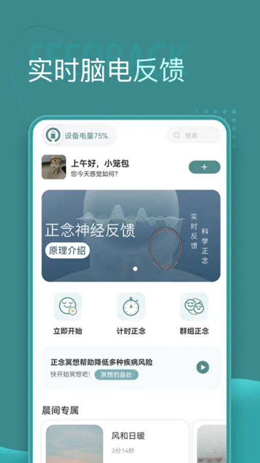 用科学感受当下。背景音效根据脑电活动实时变化,循序渐进地引导您进入正念冥想状态,让您轻松入门,掌握科学舒压、高效放松的诀窍,结束漫无目的的徘徊与费心劳苦的尝试。