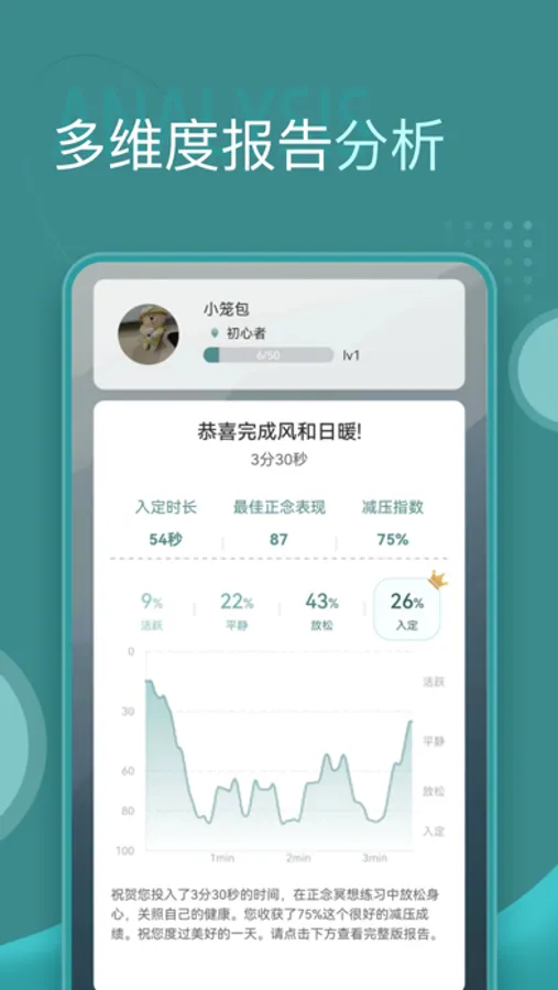 训练完成后,您将获得包含不同维度解析的全面报告;用科学的数据分析您的正念冥想状况,记录追踪您的成长全过程,让自己成为更好的自己。