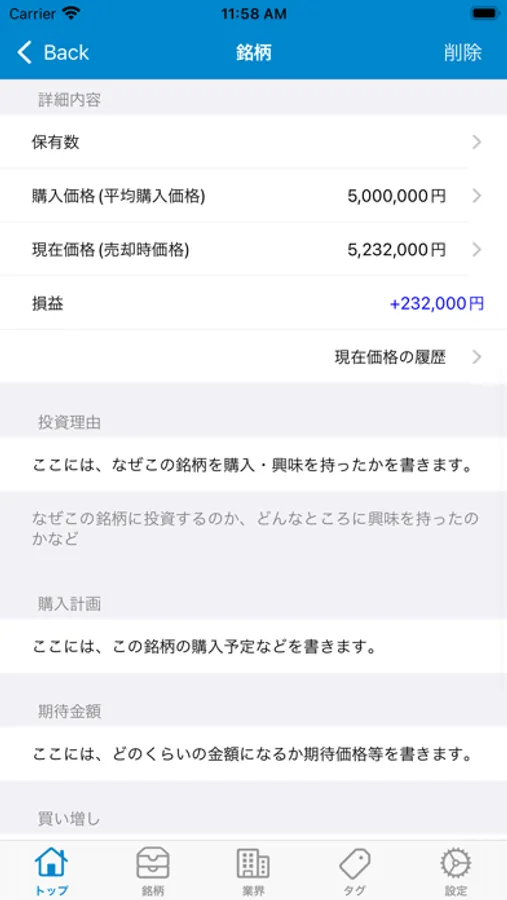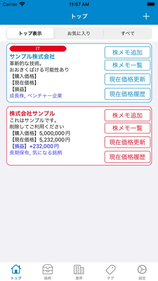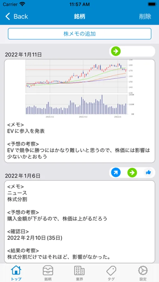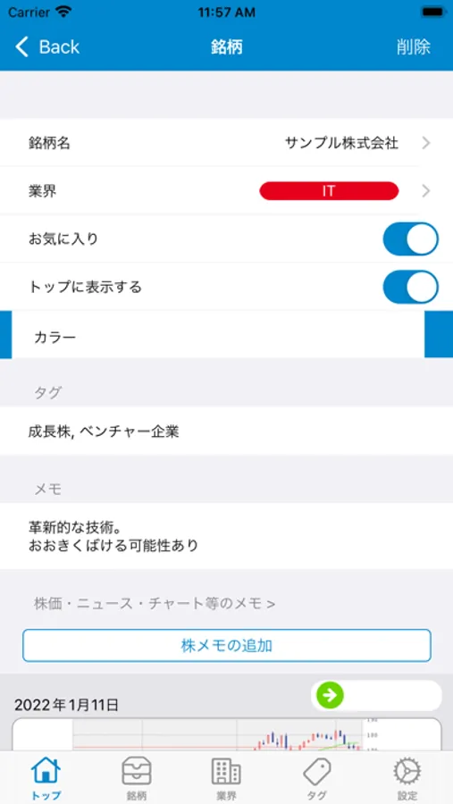 自分の気になる銘柄や保有する銘柄ごとにメモができるアプリです。