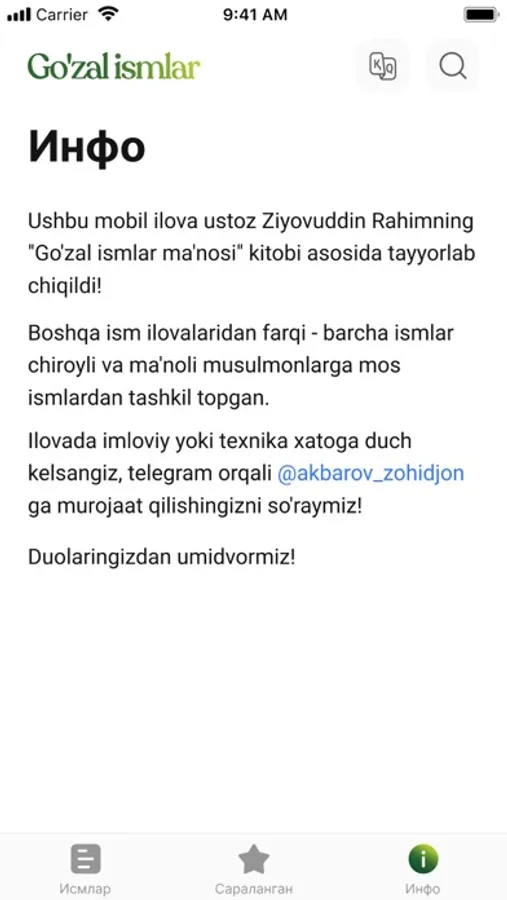 Musulmon kishi farzand ko’rishi bilan, unga mos va go’zal ma’noli ism qo’yishga harakat qiladi. Lekin uni topish va ma’nolarini o’rganish uchun ishonchli manba juda kam: xoh kitob shaklida, xoh mobil ilova shaklida.