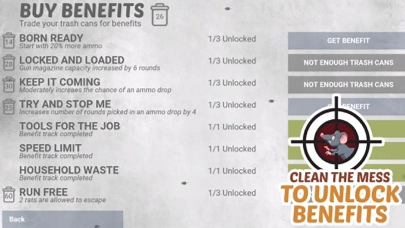 Clean up the dead rats to gain trash cans. Visit the benefits area to trade your trash cans for benefits that will assist you with killing more rats than ever before. Benefits only apply to room levels, however. You are on your own for challenges. Trash cans are vital to unlocking more rooms and challenges. Clean up the dead rats whenever you can.