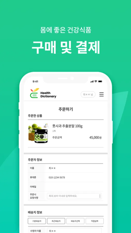 전체 시스템이 본인의 건강사전을 구현하도록 구성되어 있습니다. 추천제품은 건강식품과 건강기능식품 2가지 타입으로 구성되어 있으며, 건강식품은 자사제품이며 건기제품은 제약회사 제품 등이 입점 되어 있습니다.
