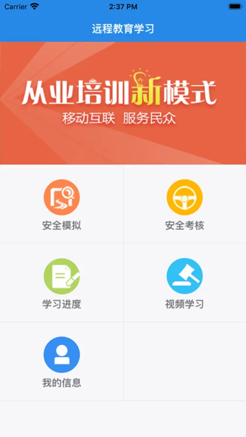 远程教育学习app主要为了解决福建省道路运输企业从业人员继续学习的平台,学员通过平台报名后,用身份证号和初始密码进行app登陆学习,内容包括我的信息、模拟练习、安全考核、学习进度、视频学习。