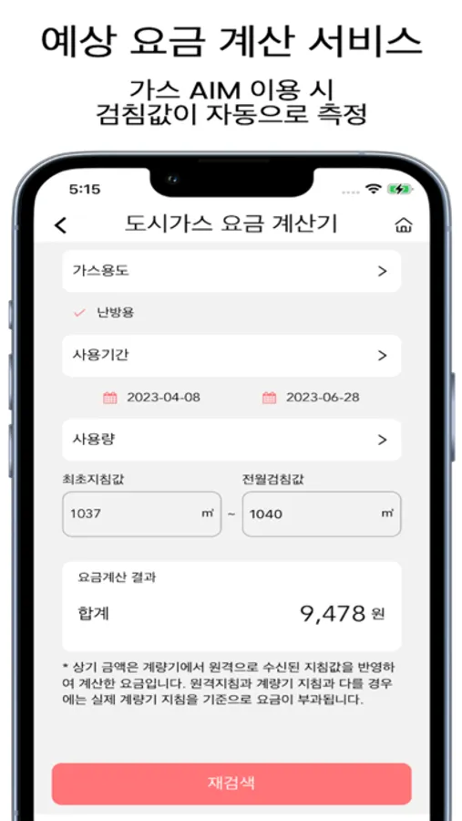현재까지의 가스 사용량 및 예상 사용 요금을 조회하세요.